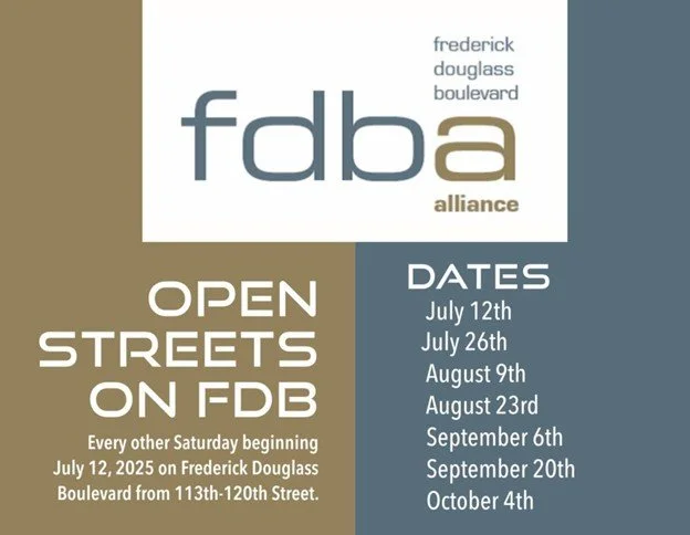 The Frederick Douglass Boulevard Alliance (FDBA) is pleased to announce that for the 5th consecutive year we will be sponsoring the 2025 Open Streets on FDB. For this year please note that the schedule for Open Streets on FDB will only occur every other Saturday, beginning July 12th through October 4th from W. 113th-120th streets. The hours of operation are 12:00pm-9:00pm and during this time there is no parking. Our weekly schedule will be shared across our social media platforms.