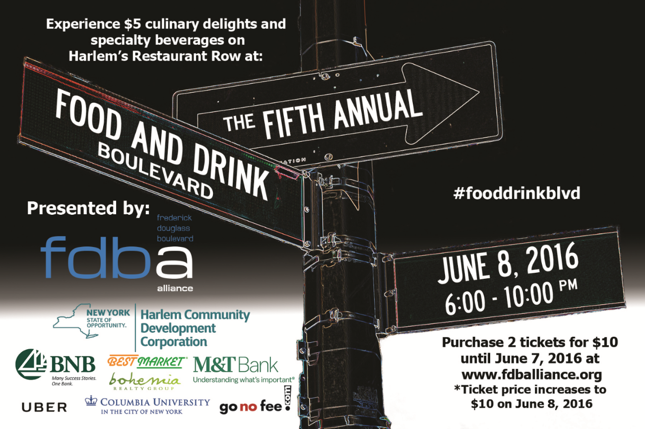 On June 8, 2016 from 6:00 to 10:00 p.m., the Frederick Douglass Boulevard Alliance will hold its fifth annual Food & Drink Boulevard event, an evening of food, cocktails, music and entertainment along Harlem’s Restaurant Row on Frederick Douglass Boulevard from 110th to 124th Streets. Food & Drink Boulevard kicks off the summer in the city and invites local residents and visitors to explore restaurants and bars along the Frederick Douglass Boulevard corridor by buying tickets to receive significant discounts at each participating venue. Explore the Gateway to Harlem, and sample food and drinks at the various establishments involved in Food & Drink Boulevard, each featuring its own unique flavor and vibe.
